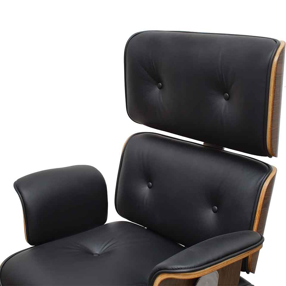 High back executive office chair finished in durable plywood with walnut veneer. Soft black Italian leather and steel back support frame.
